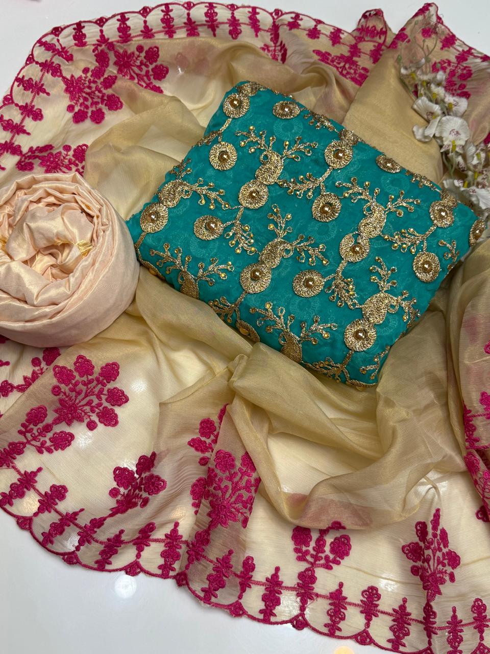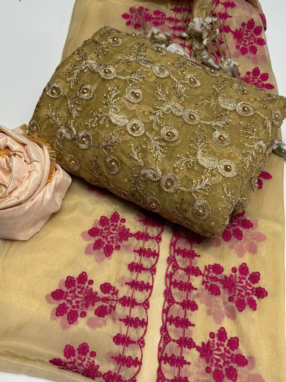 • Shirt: Fancy crinkle chiffon jaal design, embroidered front & back
