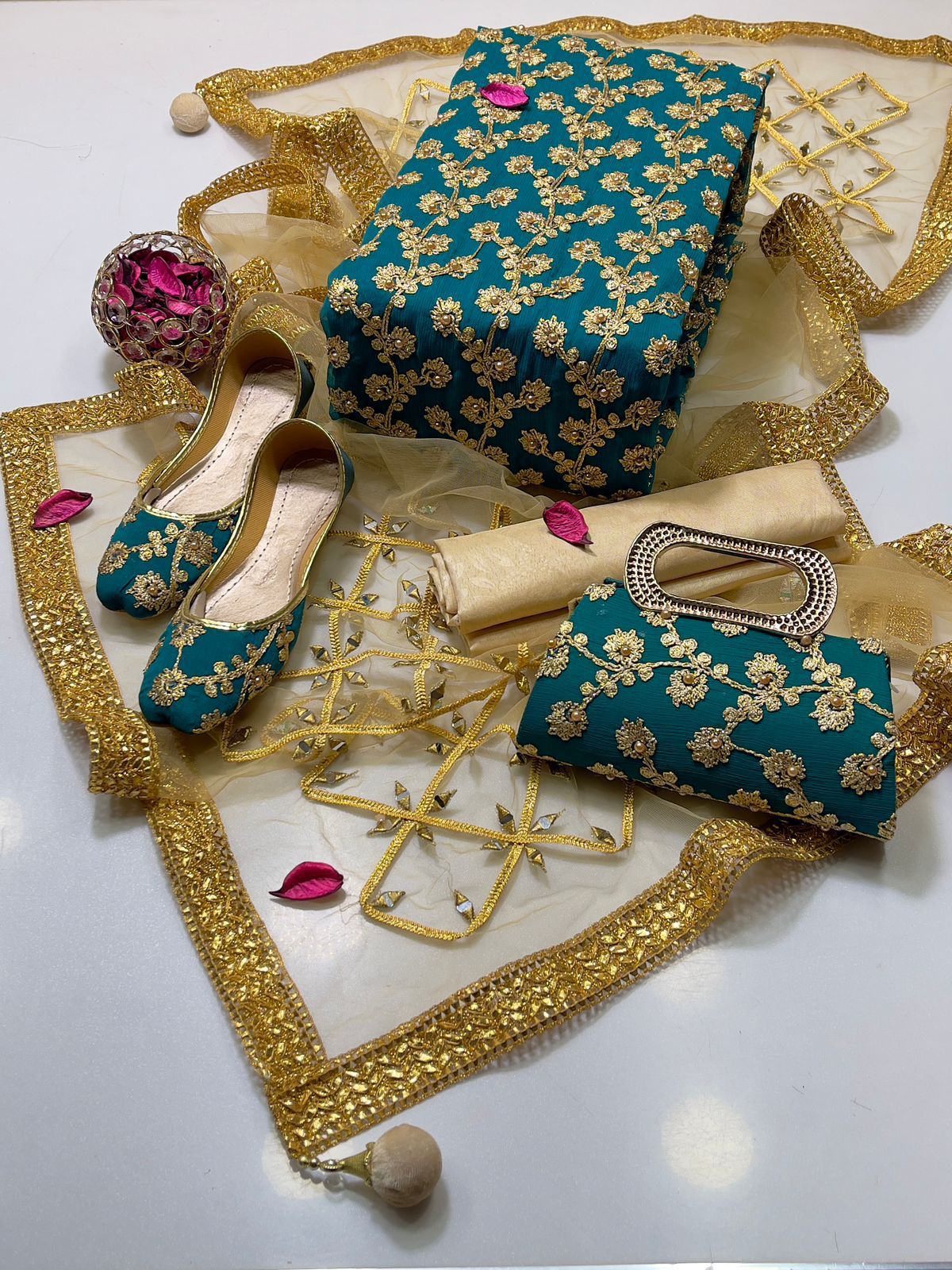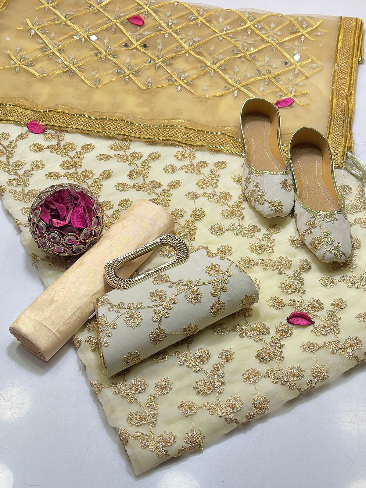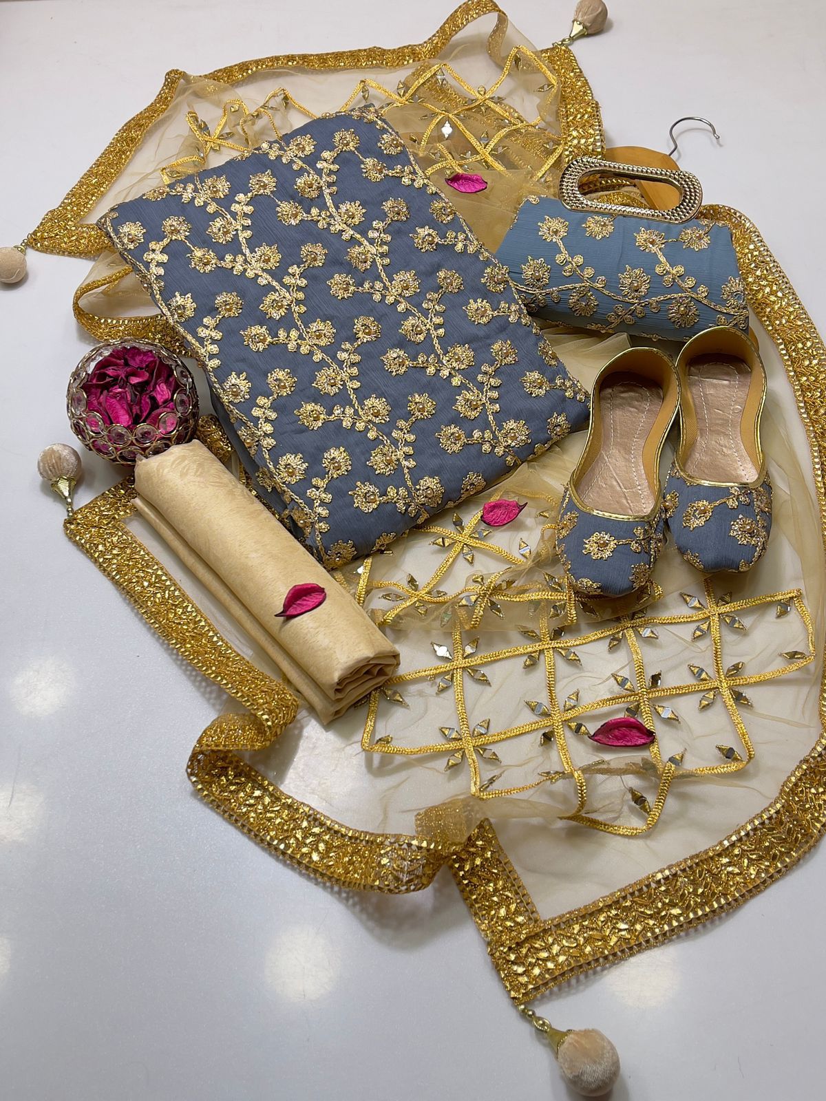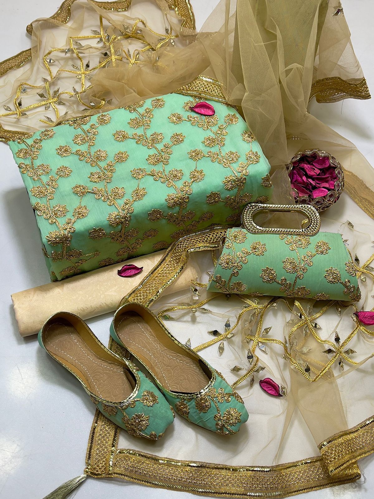 • Clutch: Completing the set is a matching clutch, designed to pair flawlessly with the suit. Its intricate detailing ensures you carry your essentials with sophistication and grace.