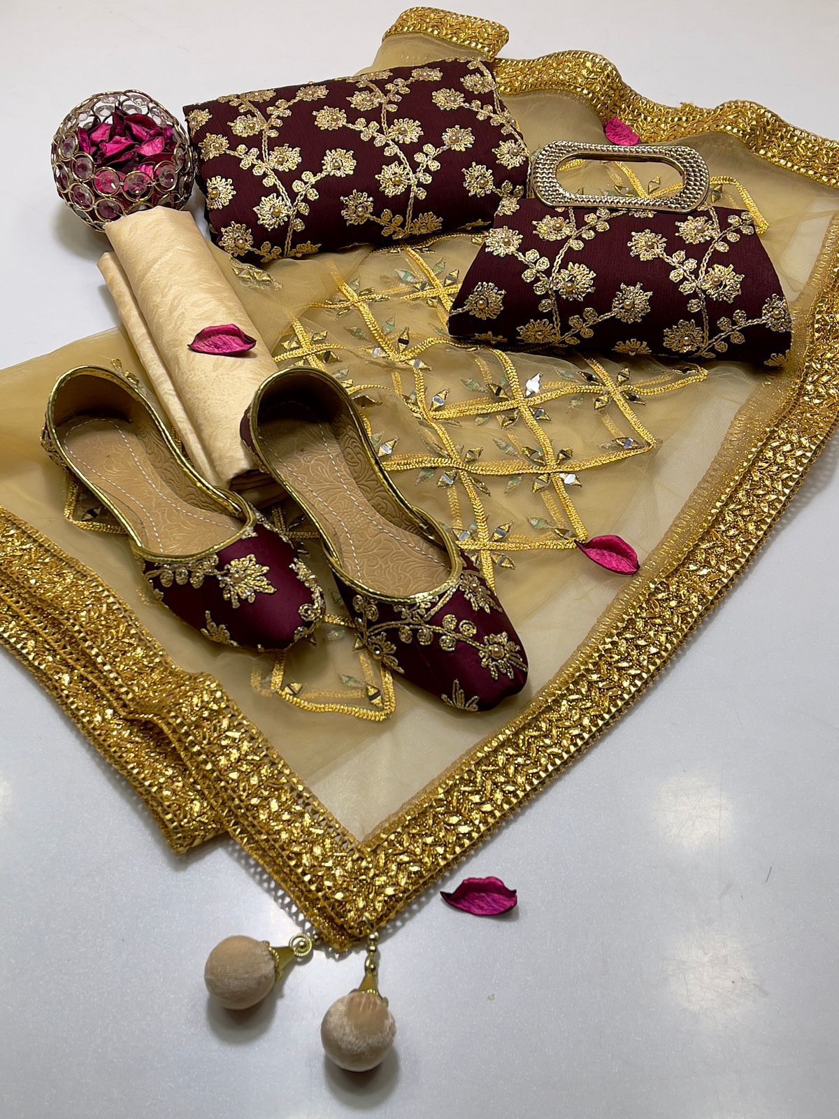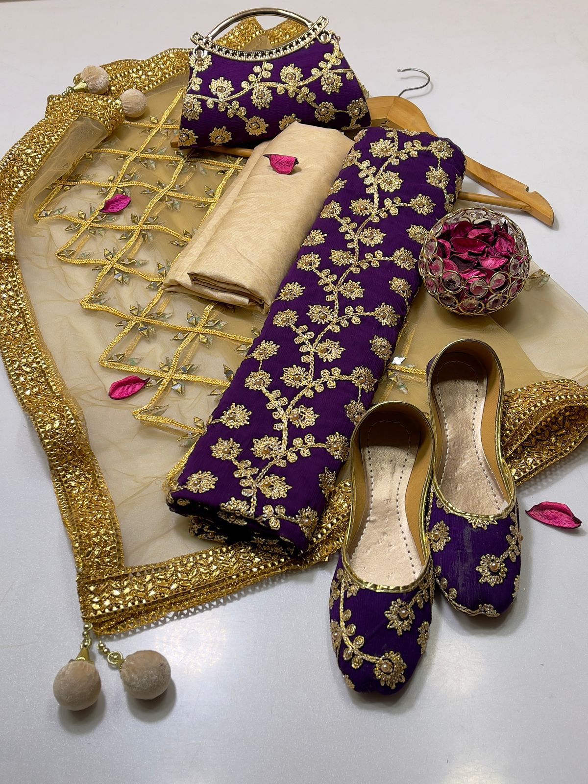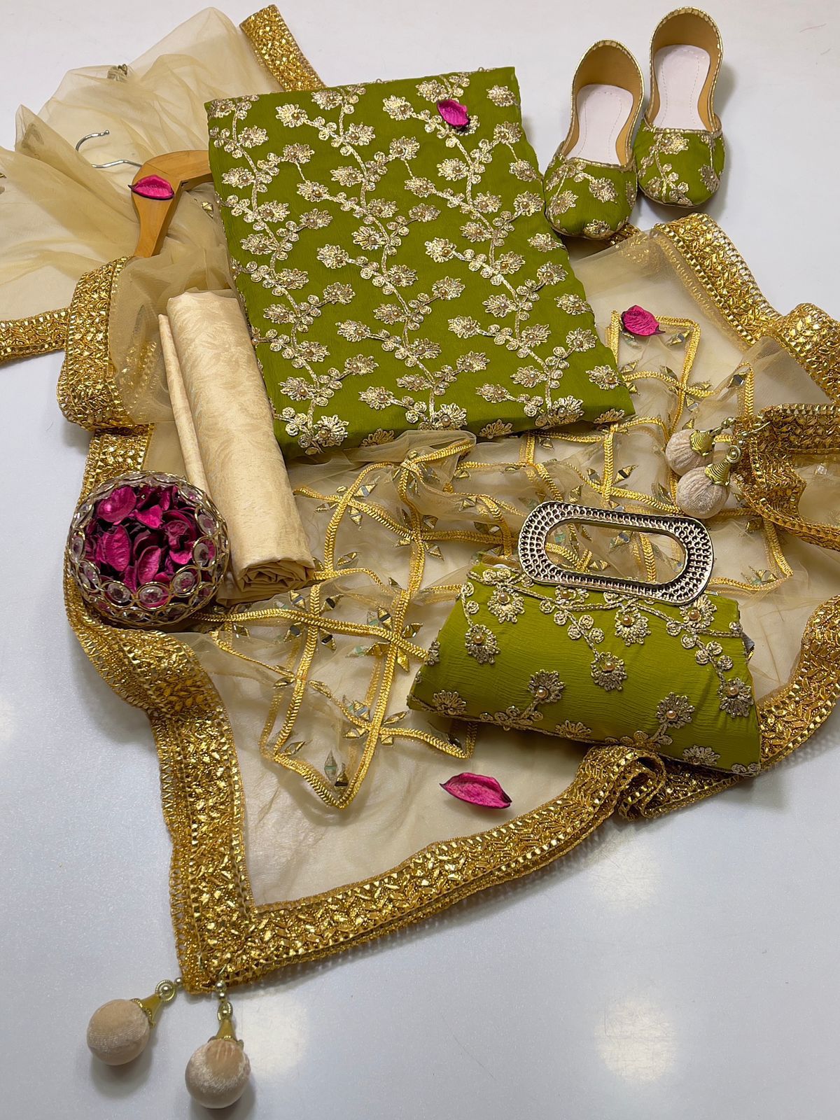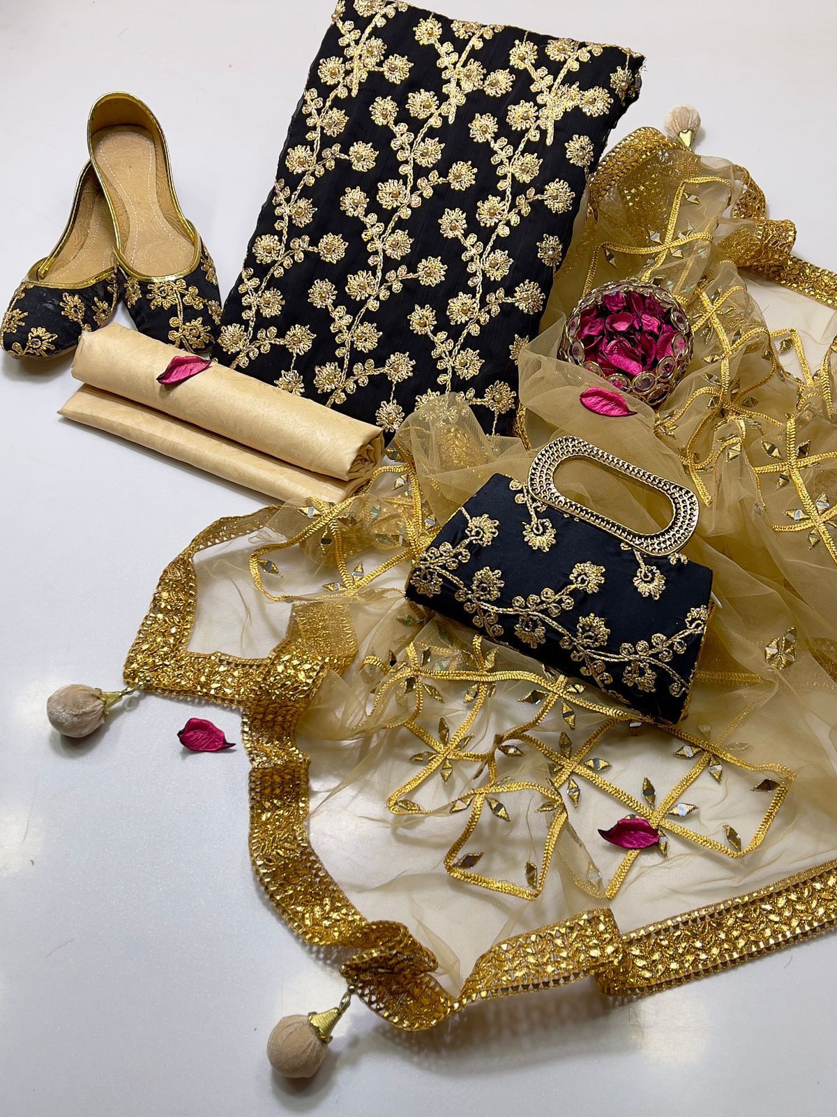 • Clutch: Completing the set is a matching clutch, designed to pair flawlessly with the suit. Its intricate detailing ensures you carry your essentials with sophistication and grace.