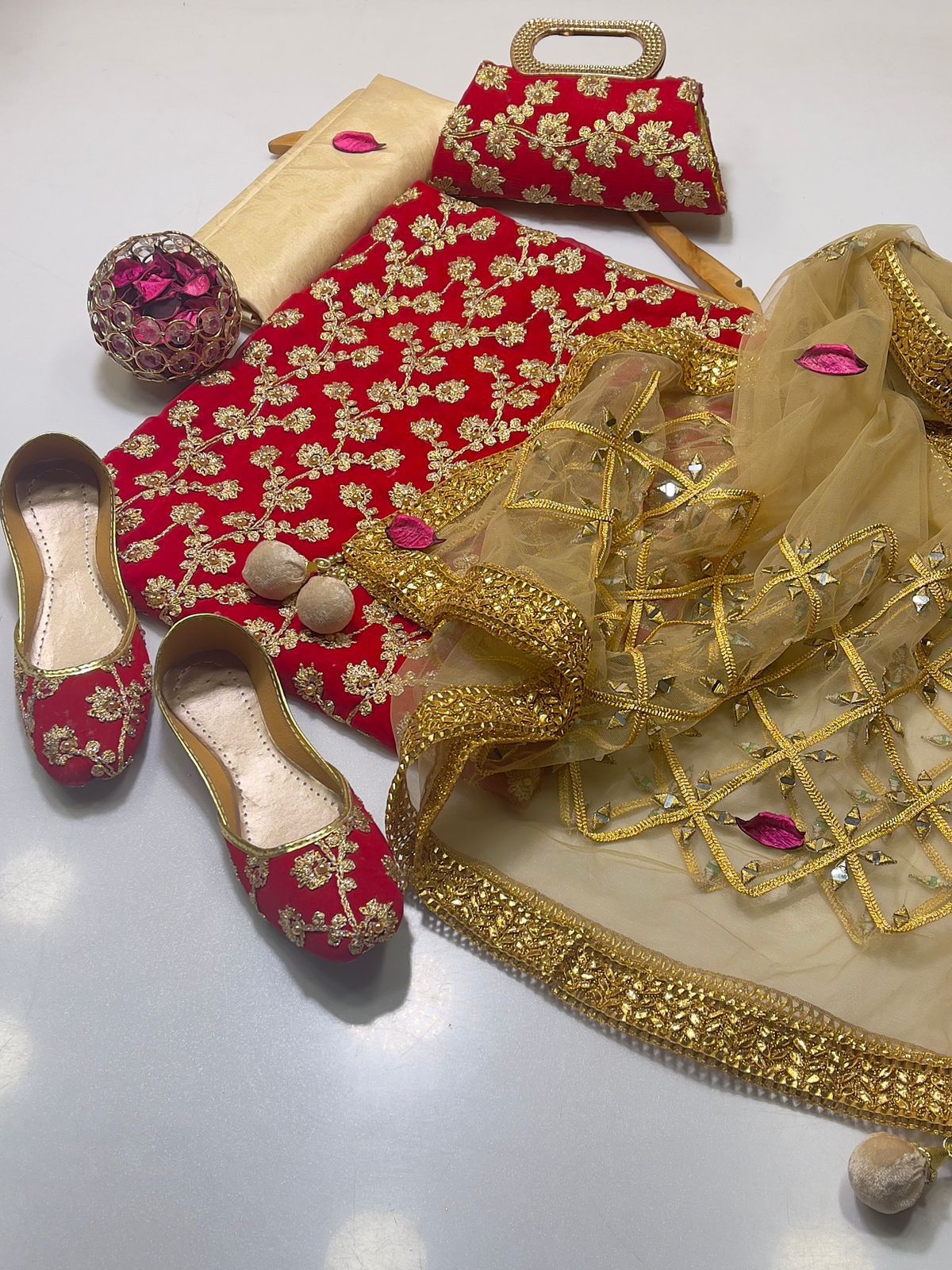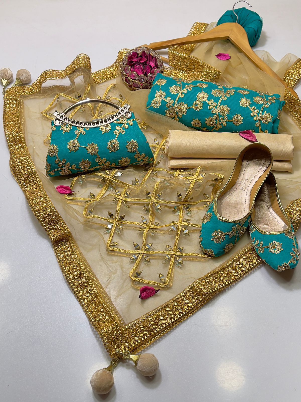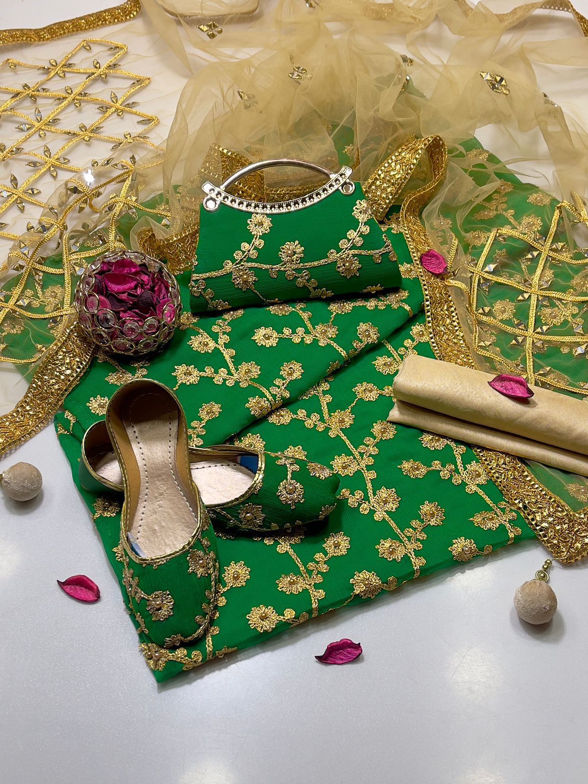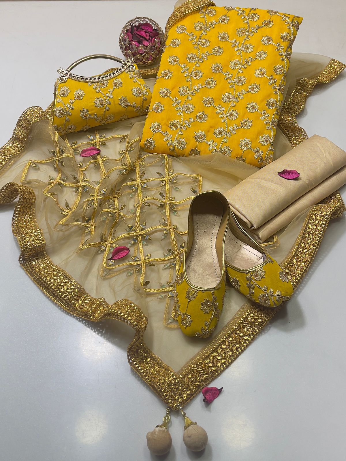 • Clutch: Completing the set is a matching clutch, designed to pair flawlessly with the suit. Its intricate detailing ensures you carry your essentials with sophistication and grace.