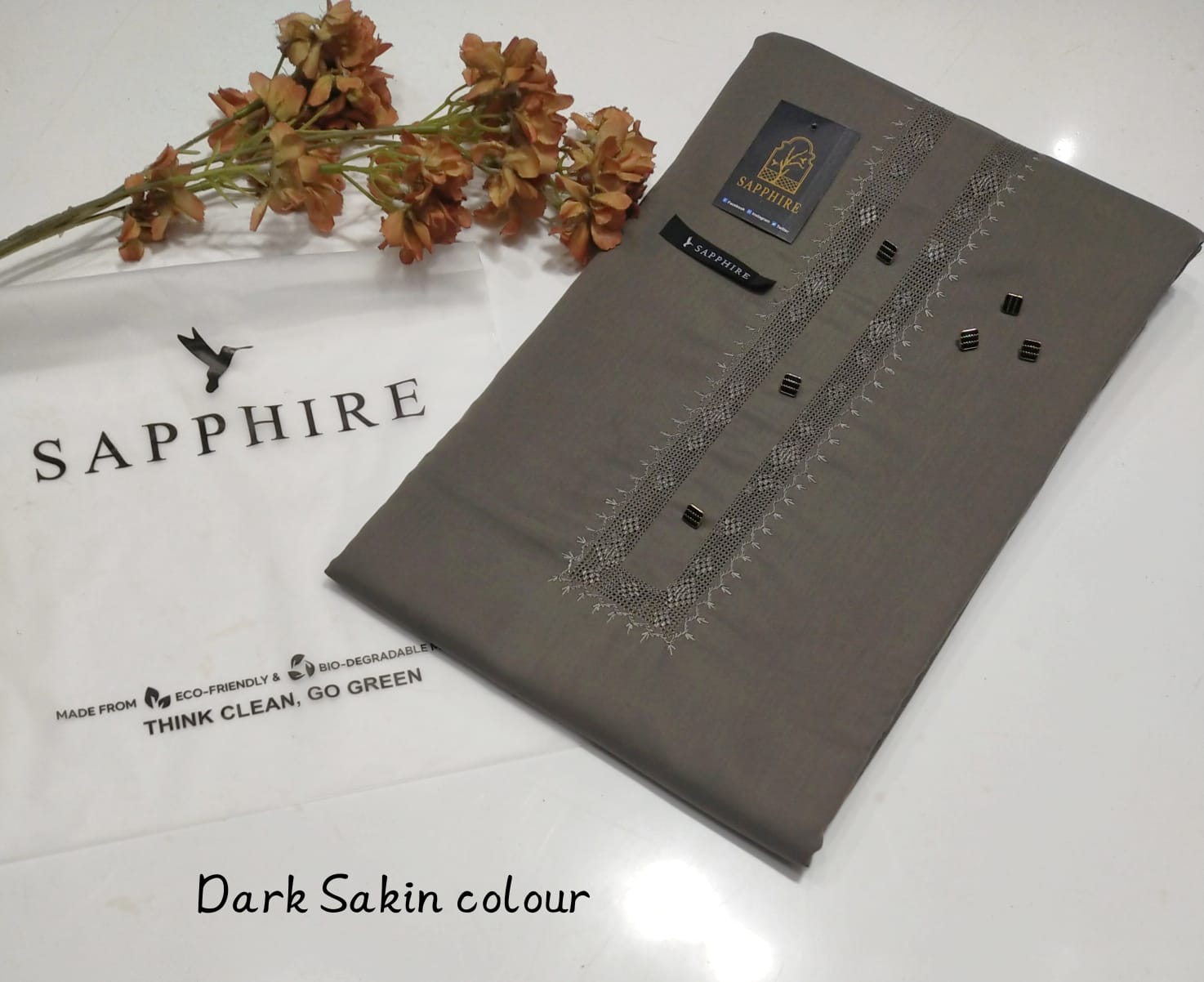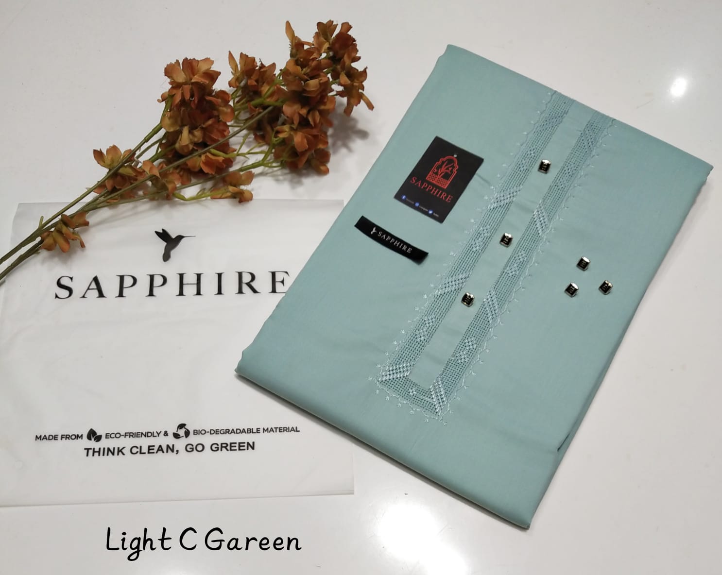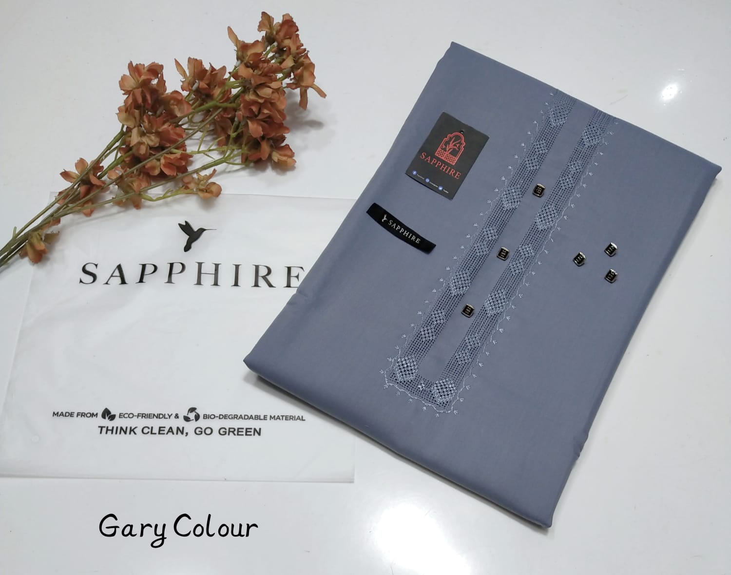 • Sapphire Color with Tag Card and Packing Bag: This suit comes in a rich sapphire color, adding a luxurious touch to your wardrobe. The packaging includes a Sapphire-branded tag card and a premium packing bag, making it a great option for gifting or special purchases.